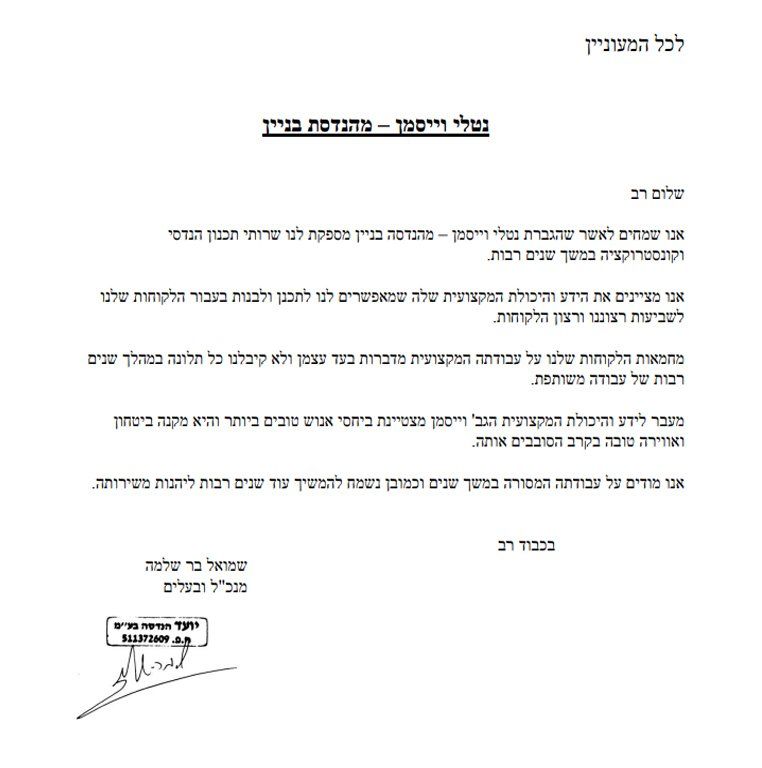 נטליה לא מפריזה בדרישות התכנוניות, דבר המעיד על חישובים מדוייקים, דאגה לתקציב הלקוח וניצול ניסיון מעשי בתחום.